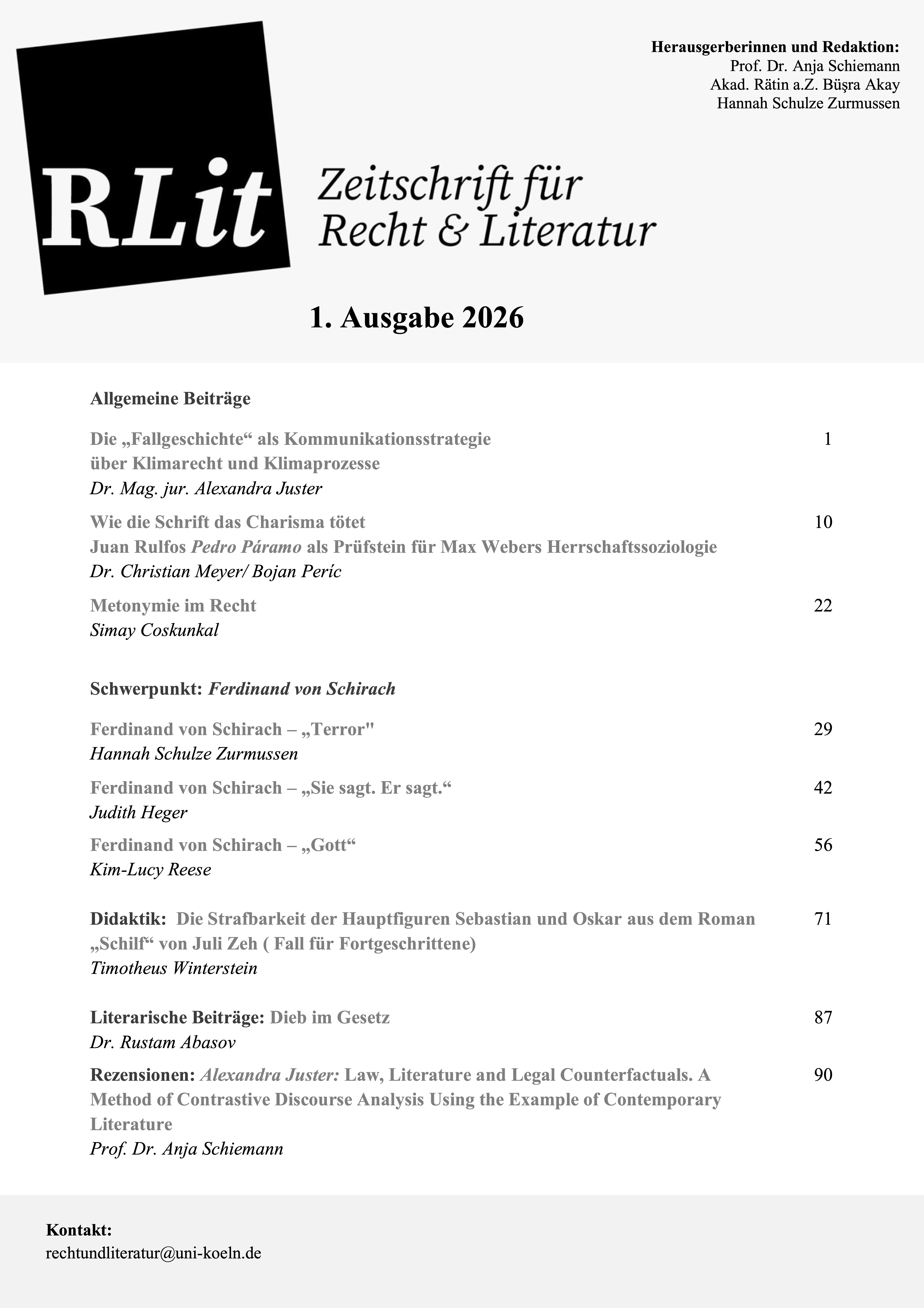 RLit ist eine interdisziplinäre Zeitschrift für Recht und Literatur. Herausgeberinnen und Redaktion: Prof. Dr. Anja Schiemann, Büşra Akay & Hannah Schulze Zurmussen.